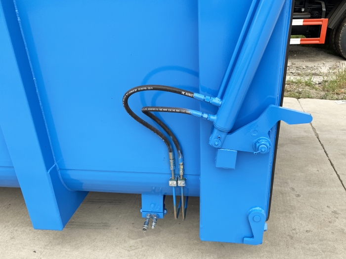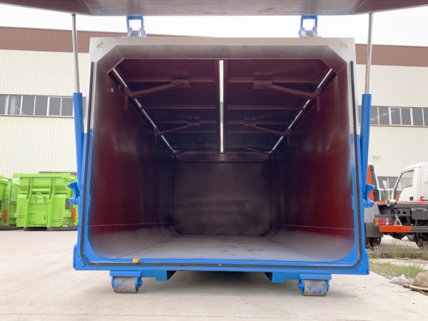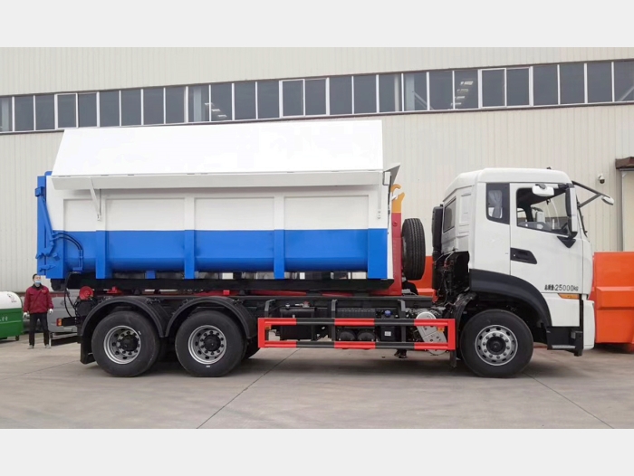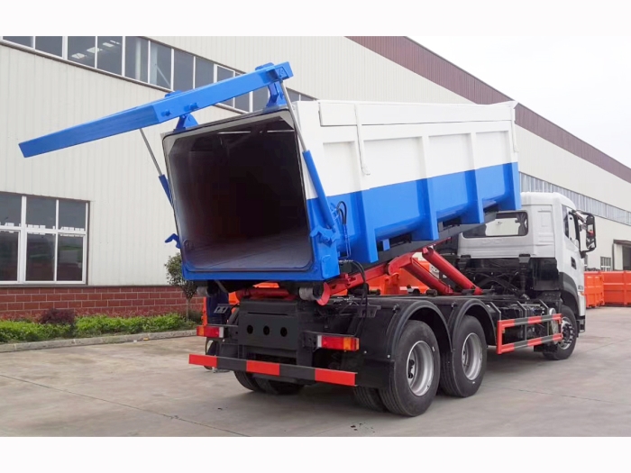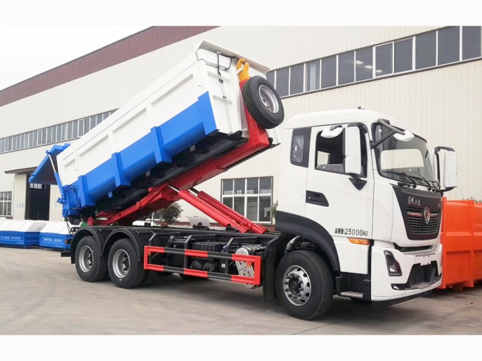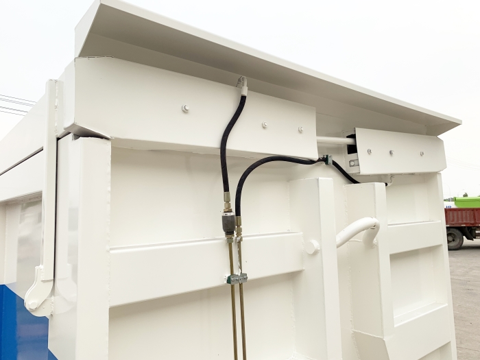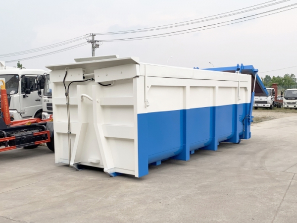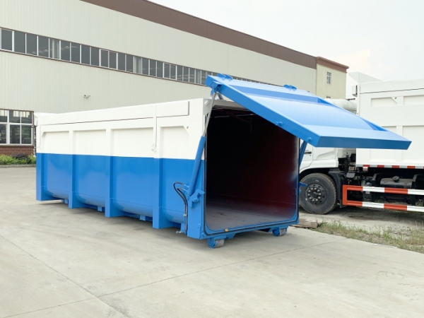 運輸介質(zhì)為:泥污垃圾,液壓后門機構密封,箱體頂部為翼展蓋,可翻轉(zhuǎn)打開,主要是利用勾臂垃圾車底盤自帶的發(fā)動機為動力,通過變速箱上安裝的取力器,取力器處安裝油泵,采用液壓機構手動或電控來實現(xiàn)箱體的上鉤、下卸、自卸等功能。車輛的箱體采用優(yōu)質(zhì)炭鋼板全密封焊接結(jié)構,具有重量輕、不產(chǎn)生二次污染等優(yōu)點。