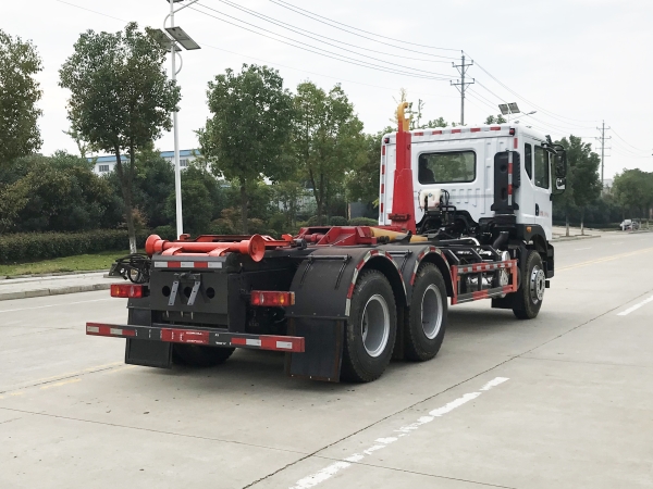車廂可卸載式垃圾車,又稱勾臂式垃圾車、拉臂式垃圾車。該車廣泛適用與城市街道學(xué)校垃圾處理,可一車配備多個(gè)斗,各個(gè)垃圾點(diǎn)放置多個(gè),帶自卸功能,液壓操作,方便傾倒。在平日里可將車載垃圾箱放置到各個(gè)垃圾收集站,待垃圾收集滿后,該車可直接開赴至垃圾站,通過液壓系統(tǒng)的操控,可將垃圾車后座上加裝的勾臂放下,掛住站內(nèi)垃圾箱前端的連接點(diǎn),將垃圾箱拉至車體的后座上,此時(shí)即可啟動(dòng)車輛,將垃圾運(yùn)送至垃圾處理站內(nèi),進(jìn)行自卸式傾倒。該車主要的優(yōu)點(diǎn)就是可一車配多斗,一輛車就可以維持?jǐn)?shù)個(gè)垃圾收集站的運(yùn)轉(zhuǎn),效率高,且箱體為密封式設(shè)計(jì),不會(huì)造成二次污染。